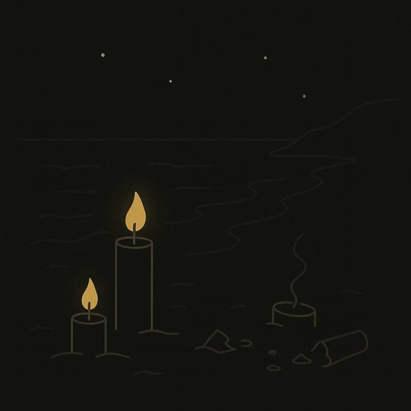 Erano luci di festa Su quella spiaggia colorata di tramonto , Le candele ballavano al suono del mare . Poi, Un tuono nel buio Da chi odia la luce. Quel suono di orrore Ripetuto a raffica. La notte pare nuda, Impaurita, Senza capirne il motivo. MM